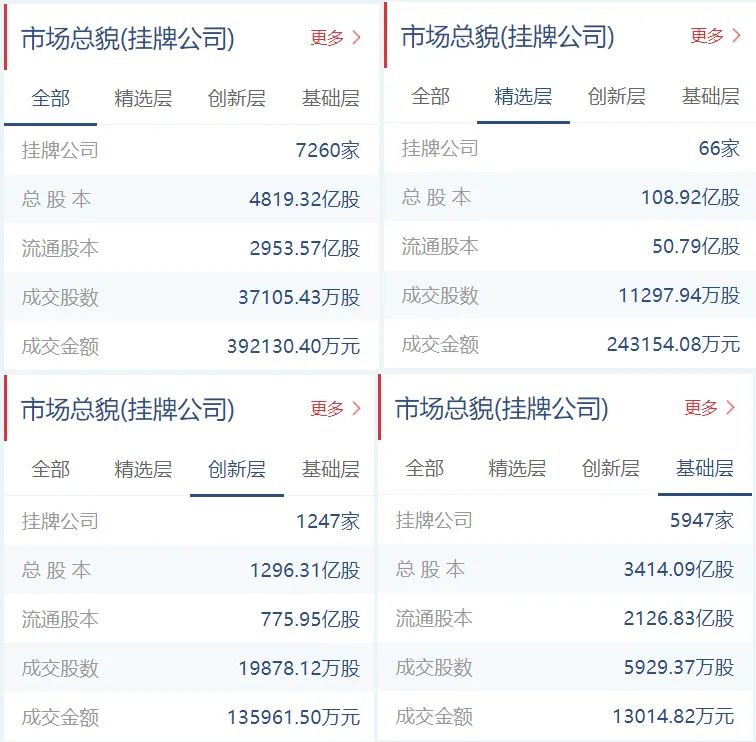 新三板挂牌公司总计7260家(精选层66家,创新层1247家,基础层5947家),总股本4819.32亿股,流通股本2953.57亿股。
