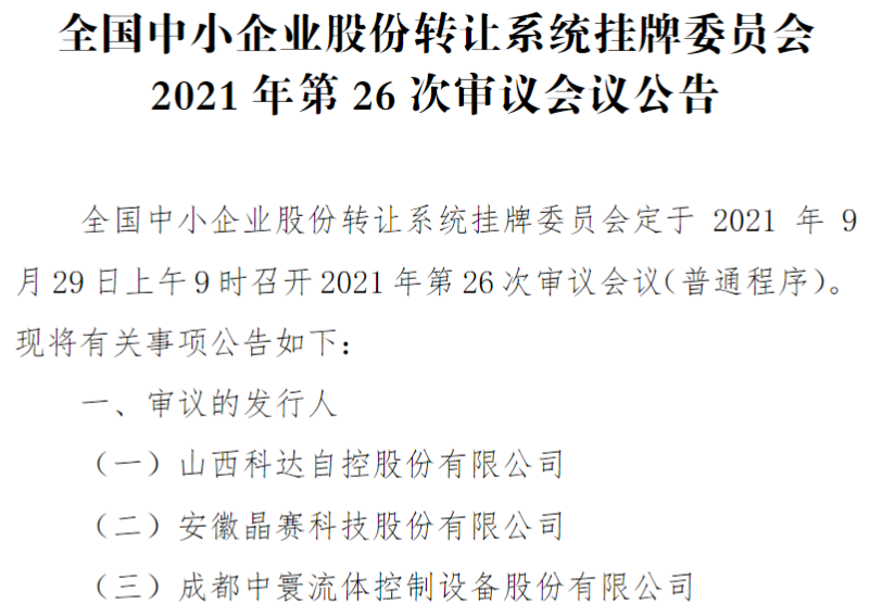 9月22日,全国股转公司发布公告称,全国股转公司挂牌委将于9月29日召开精选层2021年第26次审议会议,审议对象为科达自控(831832)、晶赛科技(871981)、中寰股份(836260)。