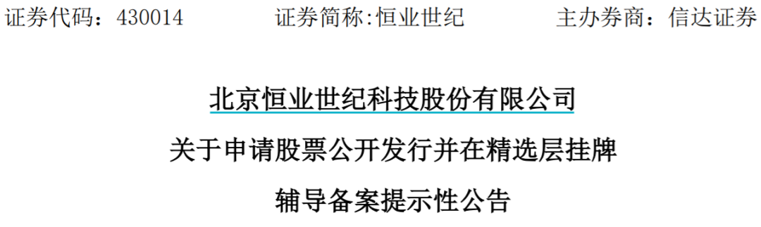 9月22日,恒业世纪(430014)发布精选层辅导备案提示性公告。