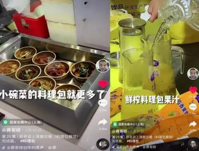今年3月,抖音大V莽哥便在上海餐饮展览会上走进了料理包展馆。对着镜头,莽哥介绍了只需要下锅50秒就可煮熟且50分钟不会坨的番茄牛肉面料理包,在某宝上价格可以卖到55块;还有保质期9个月,零下18度保存的广式腊味炒饭。视频中,不论是各种小碗菜,还是原味牛杂、泡椒凤爪,抑或是凉菜爽口黄瓜,都会在料理包里封装完好。