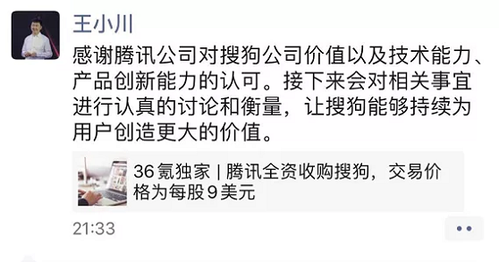 作为搜狗的大股东,腾讯做出收购搜狗的选择并不令人意外。当时张朝阳把全部的投票权用于支持该交易,并将持有的股权都卖给腾讯。不过王小川当时并不太想答应,在朋友圈发文称“接下来会对相关事宜进行认真的讨论和衡量,让搜狗能够持续为用户创造更大的价值”,因为他一直坚持搜狗独立发展。