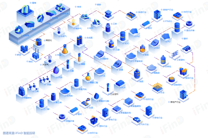 煤化工产业链是指基于化工产品上下游(包括原料)为联系的产品链条,一般包括原料(主要是煤炭)和多种化工产品。