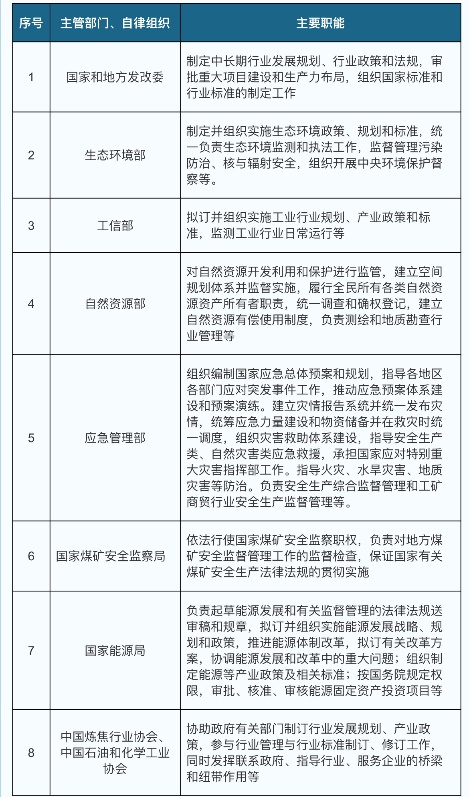 目前,我国煤化工行业的主管部门主要包括国家和地方发改委、生态环境部(原环保部)、工信部、自然资源部(原国土资源部)、应急管理部(原国家安监总局)、国家煤矿安全监察局和国家能源局;自律组织包括中国炼焦行业协会、中国石油和化学工业协会。