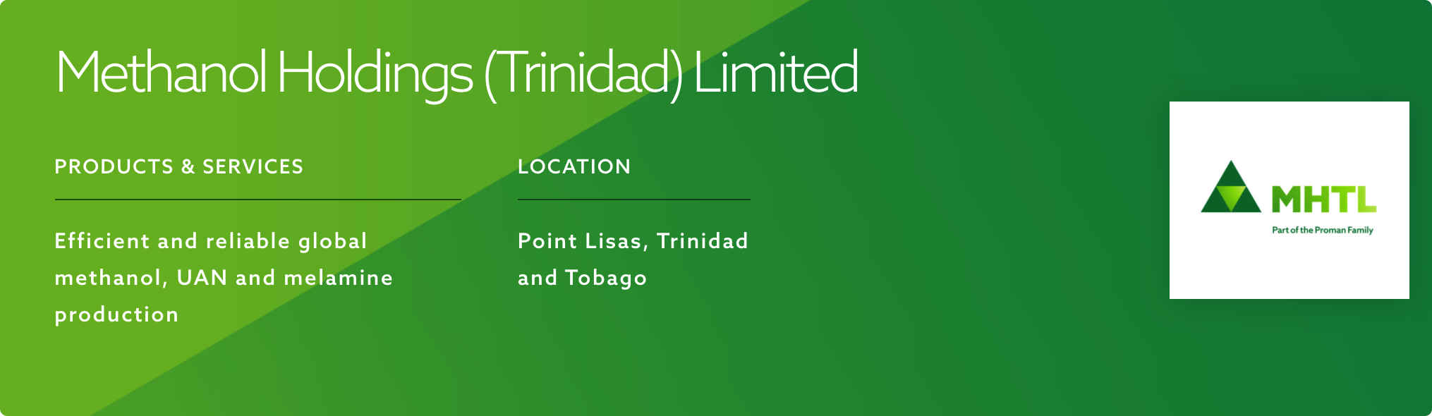 5/ Methanol Holdings (Trinidad) Limited成立于1999年,是合并Trinidad and Tobago Methanol Company、Caribbean Methanol Company Limited和Methanol IV Company Limited三家公司后成立的。2004年,在集团重组合并后,Consolidated Energy Limited成为该公司的唯一股东。Methanol Holdings (Trinidad) Limited总部设在特立尼达和多巴哥的工业基地利萨斯角港。在2010年开始生产氨、UAN和三聚氰胺后,成为多产品石油化工生产公司。Methanol Holdings (Trinidad) Ltd的甲醇和AUM工厂的运营已经外包给一家从事运营与管理的公司Industrial Plant Services Limited。特立尼达和多巴哥是石油和天然气资源较丰富的国家,能源产品占国民生产总值的40%左右,是全球主要的甲醇、天然气出口国。