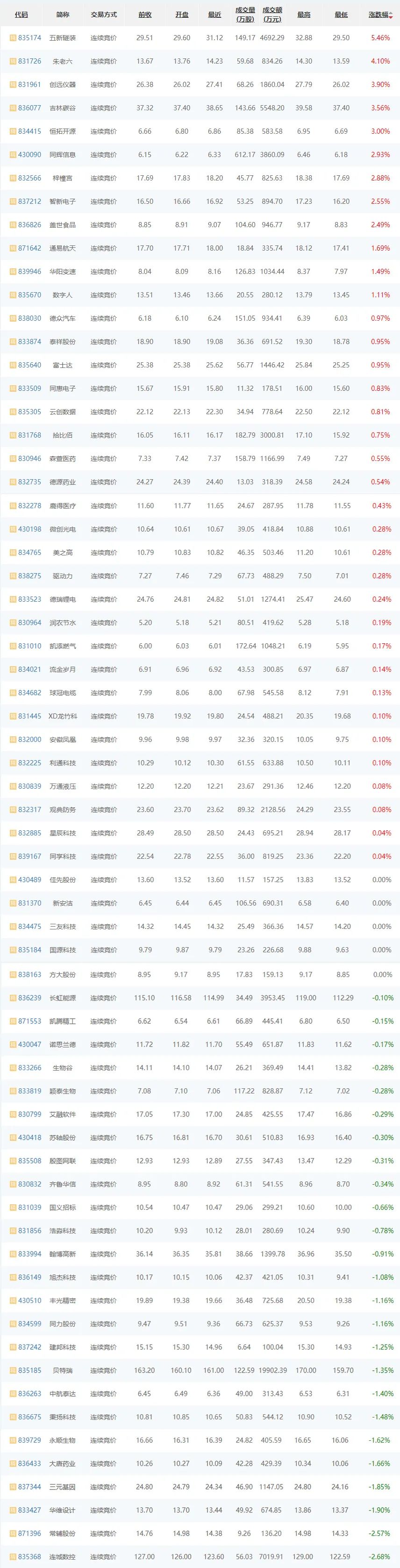 9月23日,精选层普跌,36家企业上涨,5家平盘,25家下跌。其中,五新隧装(835174)涨幅居首,上涨5.46%;朱老六(831726)居次上涨4.10%;连城数控(835368)、常辅股股(871396)依次下跌2.68%、2.57%。