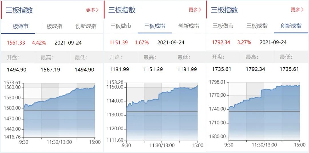 截至9月24日收盘,三板做市报1561.33点,上涨4.42%;三板成指报1151.39点,上涨1.67%;三板创新报1792.34点,上涨3.27%。