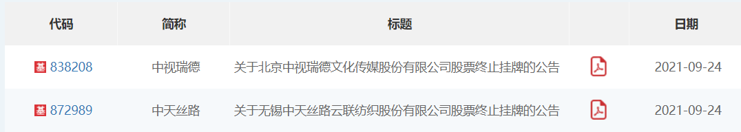 9月24日,全国股转网站显示,基础层公司中视瑞德(838208)、中天丝路(872989)终止挂牌。