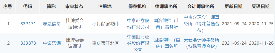 9月24日,全国股转网站显示,志晟信息(832171)、中设咨询(833873)均通过挂牌委会议。