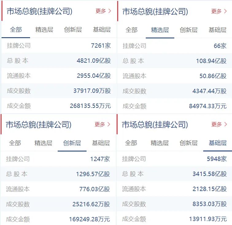 新三板挂牌公司总计7261家(精选层66家,创新层1247家,基础层5948家),总股本4821.29亿股,流通股本2955.04亿股。