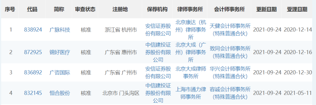 9月24日,全国股转网站显示,广脉科技(838924)、锦好医疗(872925)、广咨国际(836892)、恒合股份(832145)获得中国证监会核准批复的提示性公告。