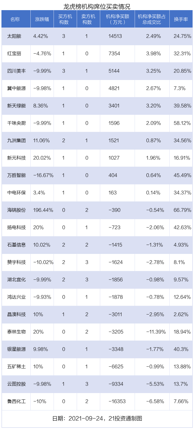其中,机构净买入金额最多的是太阳能(000591.SZ),当日收盘上涨4.42%,换手率为24.75%。