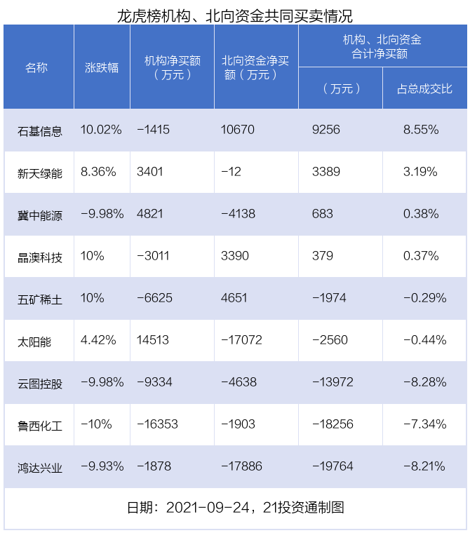 值得注意的是,机构和北向资金共同净卖出了鲁西化工、云图控股、鸿达兴业等3股;在石基信息,五矿稀土,晶澳科技,新天绿能,冀中能源,太阳能上出现分歧。