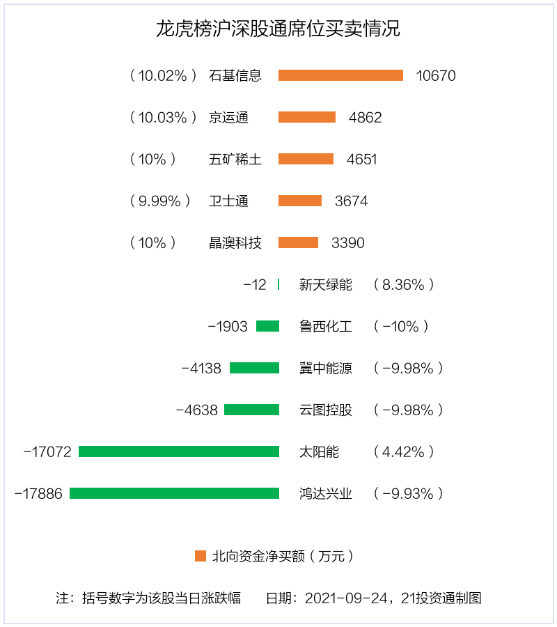 9月24日,北向资金参与龙虎榜中的个股共有11只,合计净卖出1.84亿元。其中沪股通净买入1 股,净卖出1 股,合计净买入4849.9万元;深股通净买入4 股,净卖出5 股,合计净卖出2.33亿元。