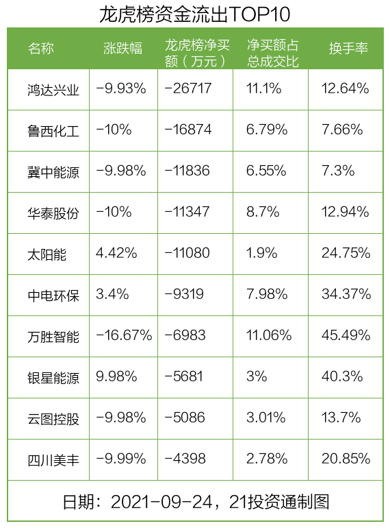 而龙虎榜中资金净流出最多的是鸿达兴业(002002.SZ),被净卖出为2.67亿元,占总成交金额的11.1%。鸿达兴业收盘下跌9.93%,换手率为12.64%。近日,鸿达兴业表示,公司在做好氯碱业务的基础上,大力发展氢能源、土壤改良等业务,提高经营业绩和持续发展能力。