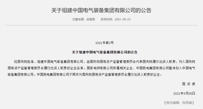 国资委:组建中国电气装备集团有限公司 中国西电不再作为国资委履行出资人职责企业