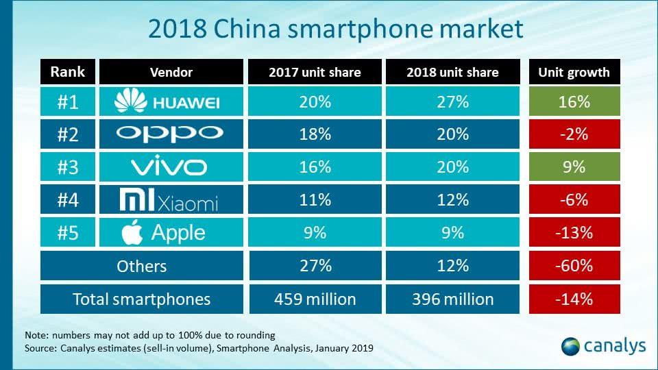 根据canalys公布的数据,2018年苹果在中国市场的销量同比下滑13%,是前五名中唯一一家出现两位数下跌的品牌。相比之下,华为高端手机的出货量在2018年实现倍增,OPPO、vivo、小米的市场份额也都得到提升。