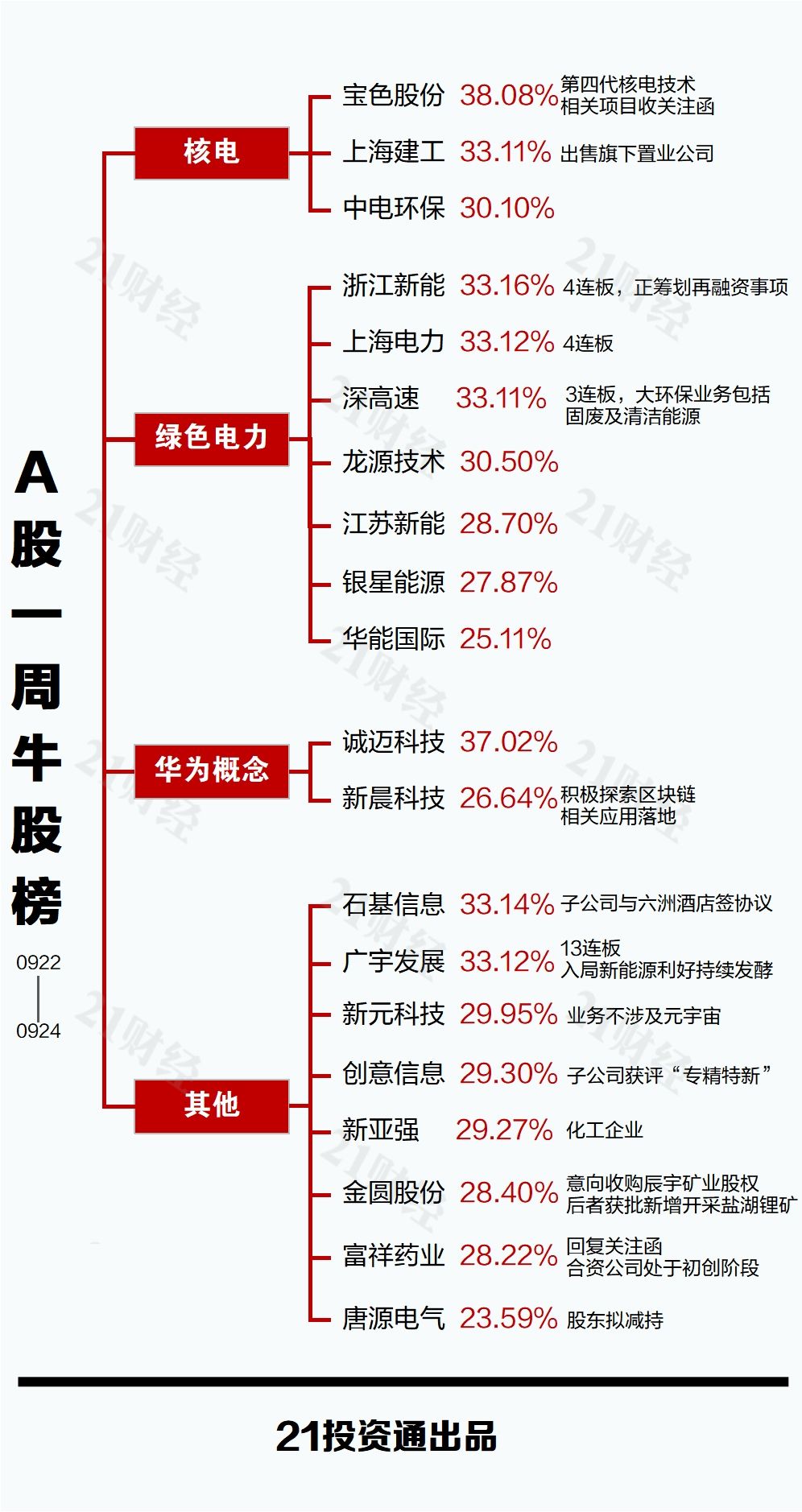 另外,国家发改委、能源局近期正式批复了《绿色电力交易试点工作方案》,绿色电力交易试点启动。9月以来,Wind电力指数涨超20%。中秋节后三个交易日,多只绿色电力及风电概念股大涨,其中浙江新能、上海电力(600021.SH)、深高速(600548.SH)连板。