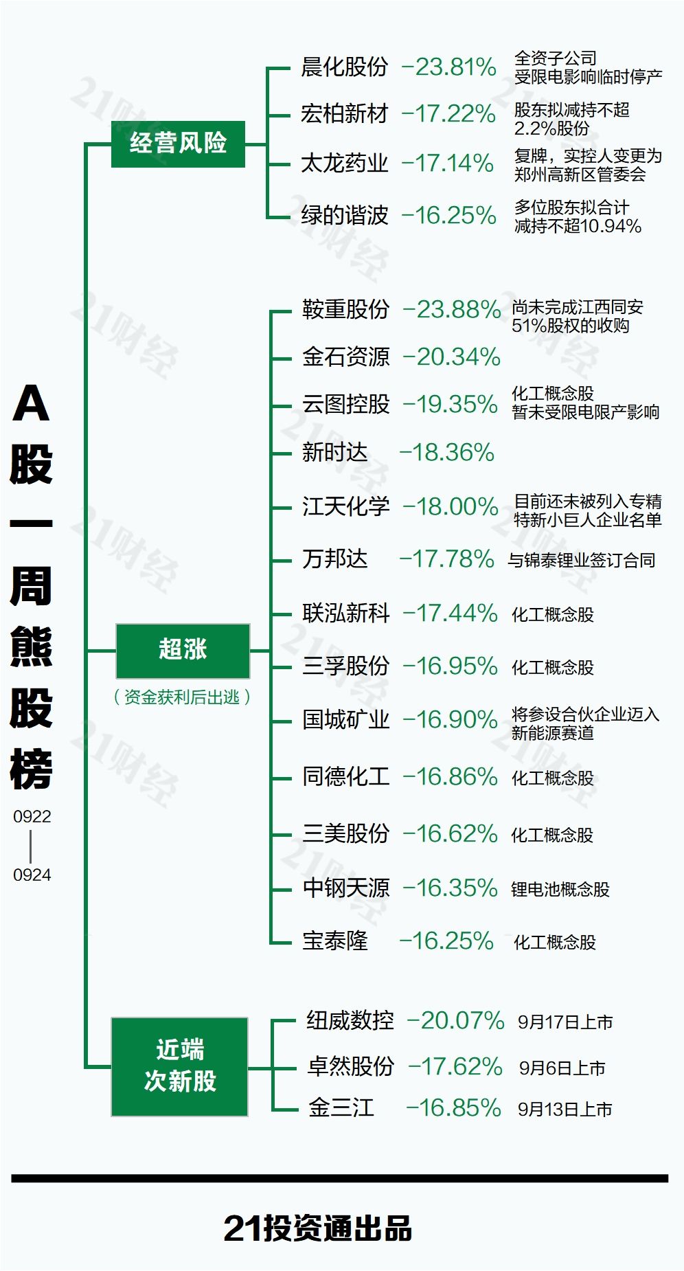 除此以外,近日,江苏、云南、浙江等多地陆续下发“能耗双控”文件,高耗能高污染行业面临限电限产,前期大涨的化工板块当周大幅回调,锂电池概念亦受波及下跌。