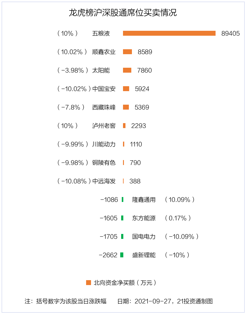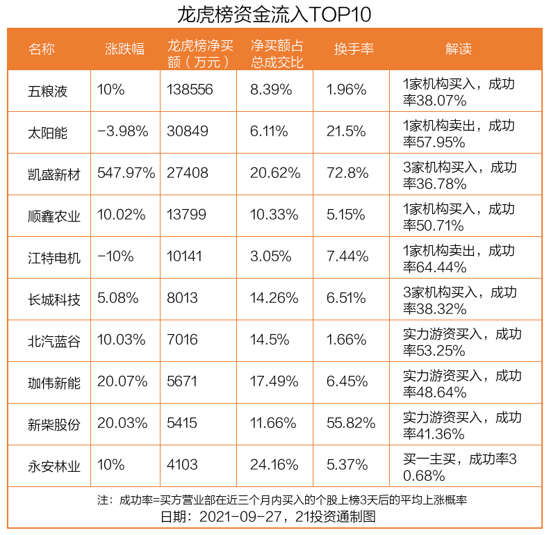 9月27日,上证指数下跌0.84%,深证成指下跌0.09%,创业板指上涨0.74%。盘后龙虎榜数据显示,共有41只个股因当日异动登上龙虎榜,资金净流入最多的是五粮液(000858.SZ),达13.86亿元。