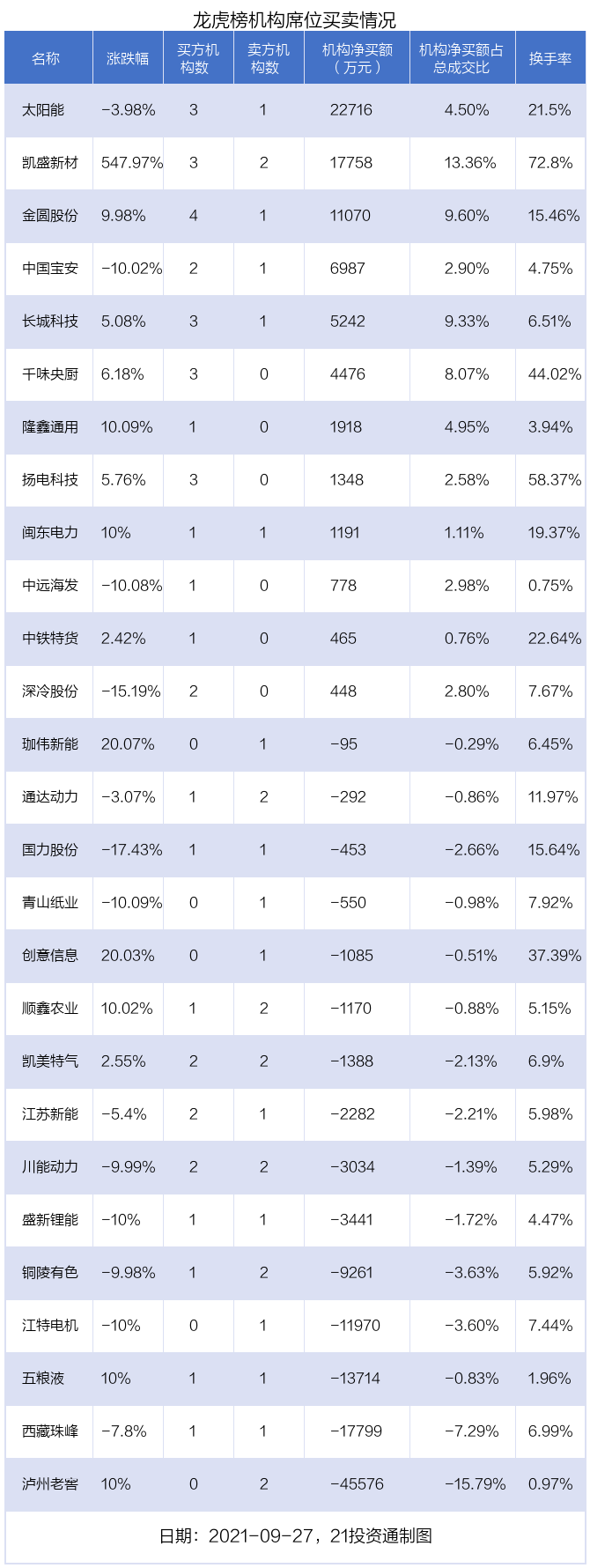 其中,机构净买入金额最多的是太阳能(000591.SZ),当日收盘下跌3.98%,换手率为21.5%。