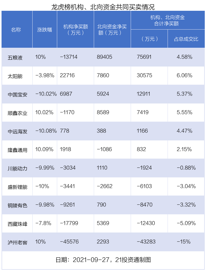 值得注意的是,机构和北向资金共同净买入了太阳能、中国宝安、中远海发等3股;共同净卖出了盛新锂能;在五粮液、顺鑫农业、西藏珠峰、泸州老窖、川能动力、铜陵有色、隆鑫通用上出现分歧,机构净卖出五粮液1.37亿元,北向资金净买入8.94亿元。