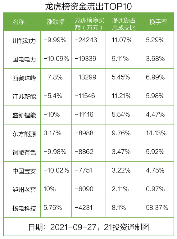 而龙虎榜中资金净流出最多的是川能动力(000155.SZ),被净卖出为2.42亿元,占总成交金额的11.07%。川能动力收盘下跌9.99%,换手率为5.29%。