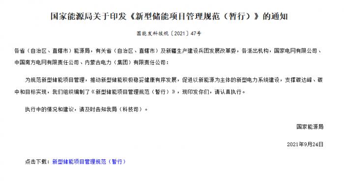近日,国家能源局印发《新型储能项目管理规范(暂行)》的通知,新建动力电池梯次利用储能项目,必须遵循全生命周期理念,建立电池一致性管理和溯源系统,梯次利用电池均要取得相应资质机构出具的安全评估报告。已建和新建的动力电池梯次利用储能项目须建立在线监控平台,实时监测电池性能参数,定期进行维护和安全评估,做好应急预案。电网企业应公平无歧视为新型储能项目提供电网接入服务。电网企业应按照积极服务、简捷高效的原则,建立和完善新型储能项目接网程序,向已经备案的新型储能项目提供接网服务。 地方能源主管部门会同相关部门加强新型储能项目监测管理体系建设,根据本地区新型储能项目备案、建设、运行、市场交易情况,研究并定期公布新型储能发展规模、建设布局、调度运行等情况,引导新型储能项目科学合理投资和建设。