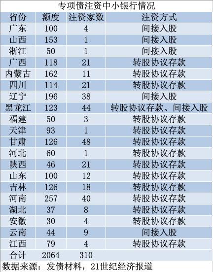 专项债注资中小行图谱: 2064亿额度通过两种方式注资20省份310家银行