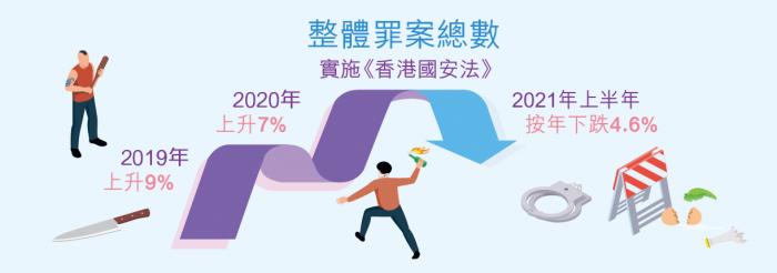 数据显示,与2019年下半年的黑暴高峰期相比,2021年上半年整体罪案数量下降近一成,妨碍公安罪行数量下降超过九成,纵火案下降近八成,抢劫案下降近六成,刑事毁坏案下降约四成。
