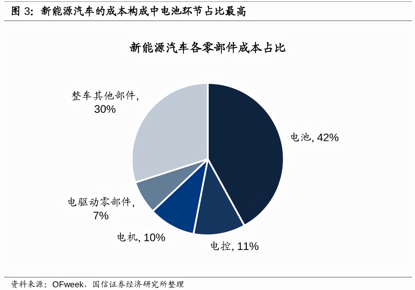 据国信证券信息,从新能源汽车的成本构成来看,电池成本相对整车环节占据 42%,电机和电控分别占据 10%以及 11%。新能源汽车的“三电”模块电池、电机、电控是核心动力总成部件,累计成本占比约 60%,大幅超越传统整车。