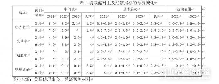 9月22日,美联储公布了政策声明和经济预测资料,与3月份比,美联储6月份的经济预测更加乐观些。如表1,美联储十八名经济学家认为,2021年经济增速将达到7%,略高于3月份的6.5%;较为一致的看法为6.8%-7.3%,也高于3月份预测值;对基本走势的分歧为6.3%-7.8%,小于3月的5.0%-7.8%;对明年、后年和长期趋势基本与3月份一致。就失业而言,经济学家们6月份的预测与3月大体一致,但普遍看法略显悲观一些。关于通货膨胀,与3月相比,经济学家6月调高了通胀预测值,2021年通胀率为3%,较一致看法为3.1-3.5%,最低值为3%,最大值为3.9%。