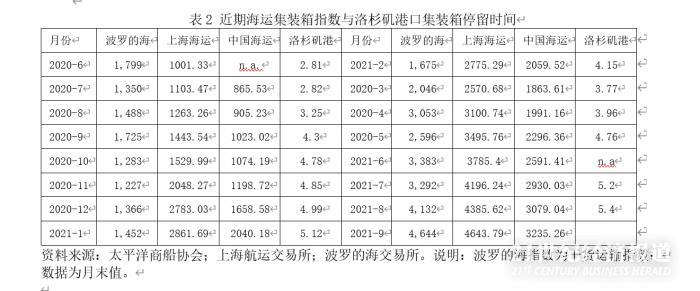 疫情导致世界港口作业效率大幅下降,货仓满负荷,货车司机缺乏,集装箱船进港难,只能在外港长时间等待。据联合国贸发组织海运统计资料显示,2019年中国、美国、香港和新加坡集装箱船停留时间分别为0.6007、1025、0.5325、0.7115天,2020年则分别为0.6208、1.0337、0.5208、0.8007天。与前两年相比,2021上半年中国、美国、香港和新加坡集装箱船的停留时间分别上升至0.6806、1.2069、0.5792、0.9993天。经洛杉矶和长滩港(分别为美国第一、第二大集装箱港口)进口的货物占美国总量的三分之一左右,2021年1-7月这两家港口的集装箱(TEU,标准箱)到港量比去年同期分别增加了37.3%、32.5%,而2020年同期比2019年下降了12.1%、4.25%。然而,2021年1-7月两大港口的集装箱离岗数量却比2020年同期分别下降了13.6%、1.3%;与2019年同期相比,2020年洛杉矶港口下降了18.3%,长滩港上涨了3.4%。可见,两大港口到港的集装箱远大于离港的集装箱,这说明大量集装箱堆在码头等待卸货。如表2所示,西部港口集装箱停留时间由2020年6月的2.81天增加到2021年8月5.4天。