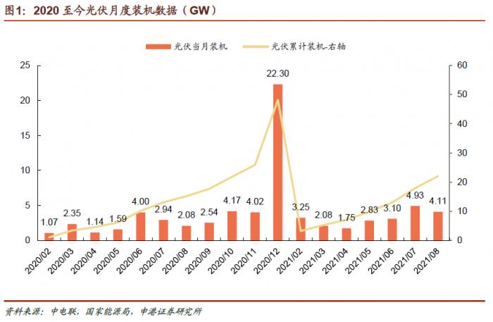 根据中电联数据,2021年8月,太阳能发电新增装机量4.11GW,同比增长97.60%,环比下滑16.73%;1-8月太阳能发电新增装机容量22.05GW,同比增长45.35%,增速较1-7月份提升8.35个百分点。