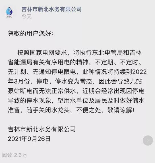 吉林市新北水务公司26日发布公告称,按照国家电网要求,将执行东北电管局和吉林省能源局有关有序用电的精神,不定期、不定时、无计划、无通知停电限电,此种情况将持续到2022年3月份,停电、停水变为常态。