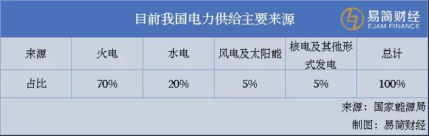 目前我国的电力供给主要来自于火电和水电,其中火电发电量占比约70%,水电占比约20%。其他的,风电、太阳能发电占比约5%,核电及其他形式发电占比约5%。