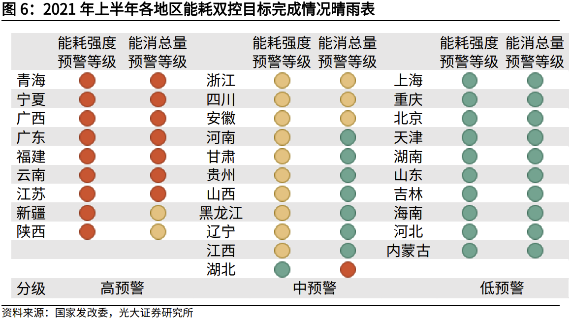 9月能耗双控措施升级,对工业生产造成短期冲击,同时限产使得上游工业品价格居高不下,继续挤压下游企业利润。9月以来,部分地区能耗双控措施升级,广西、广东、安徽等地实行阶段性限电,陕西、云南等地对“两高”行业推行限产措施,短期工业生产将受到冲击,有所回落。在上述供给约束下,将进一步推升成本压力,有色、钢铁、建材、化工等商品价格再次阶段性冲高,下游企业的成本压力不断加大,利润持续受到挤压。能源双控难以全面放松,短期政策可能会有微调,旨在保供稳价以及扶持下游中小微企业。一方面,坚决管控高耗能高排放项目仍是未来政策基调,未来能耗双控政策的影响可能持续到年底。作为“双碳”工作的前奏,能耗“双控”成为倒逼经济绿色低碳转型的主要抓手。从部分省份的限产政策来看,针对特定领域的限产措施持续到年底,例如9月11日,云南省发改委印发《关于坚决做好能耗双控有关工作的通知》,对黄磷、铝、工业硅等的限产措施持续到年底;广西对电解铝的限产措施也持续到年底。总体来看,四季度工业生产仍然会一定程度上受能耗双控政策的压制。
