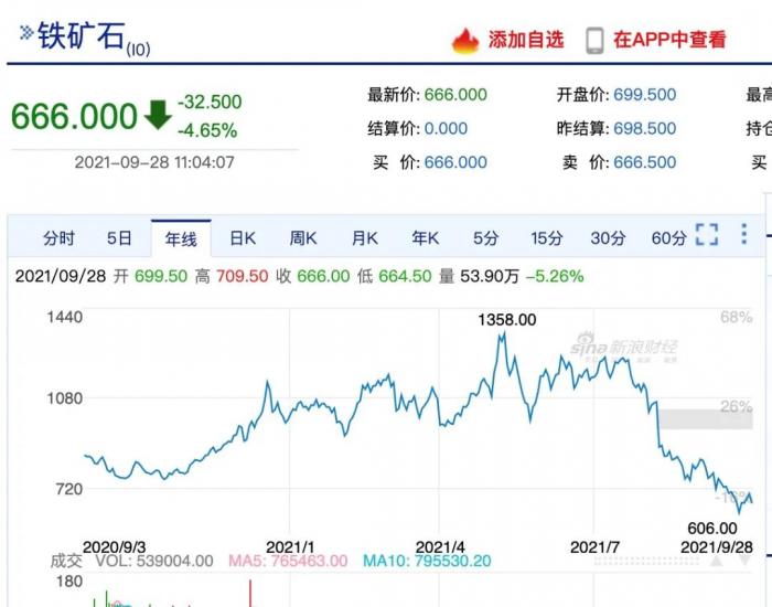 7月下旬以来,铁矿石价格持续下滑,目前国内铁矿石主力期货价格跌至700元/吨以下,今年5月曾创下1358元/吨的高点。