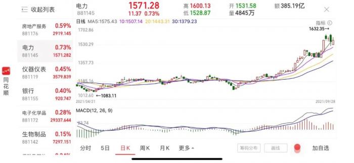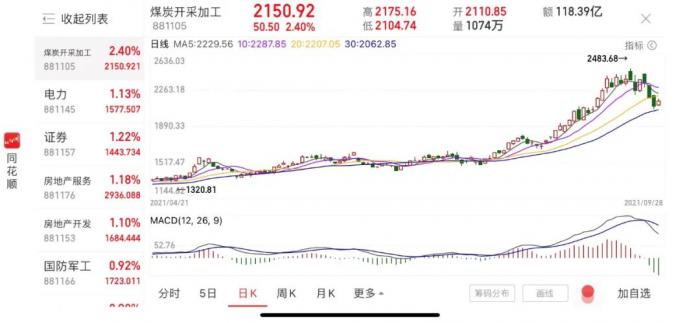 8月初开始,A股电力板块开始持续攀升,7月28日处于1107的低位,到9月28日最高突破1600。同一时期,煤炭开采加工板块也开始显著攀升,8月3日,指数为1498.48,到9月16日最高涨至2483.68,近期已经回落至2100左右。