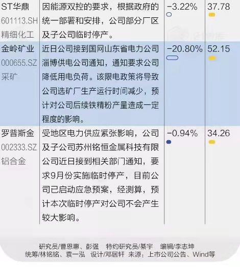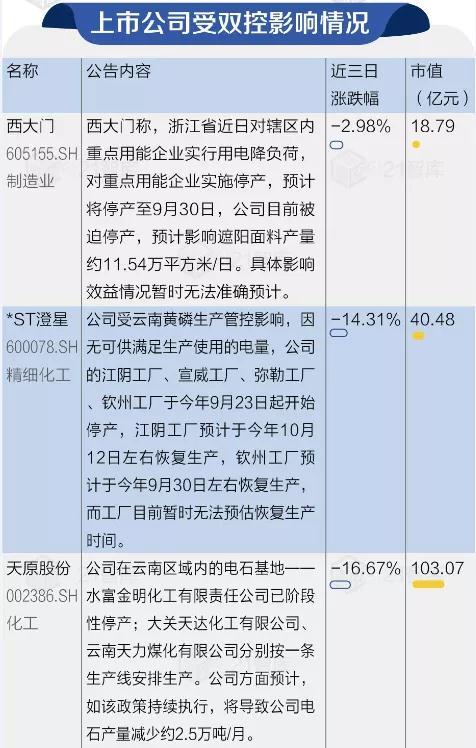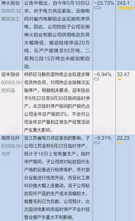 各行业的数十家上市公司纷纷公告停产、限产消息。据21世纪经济报道新能源课题组不完全统计,截至9月27日,已有23家上市公司发布了限电停产相关公告。最先宣布受到影响的,是广西的陶瓷生产企业蒙娜丽莎(002918.SZ)。