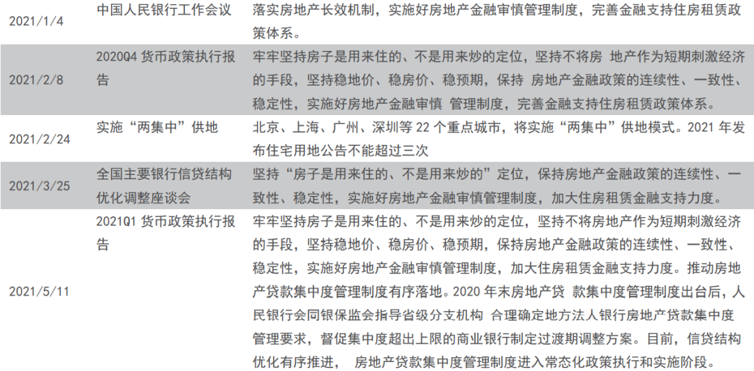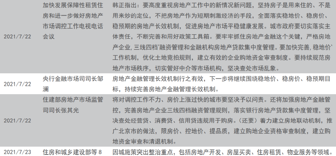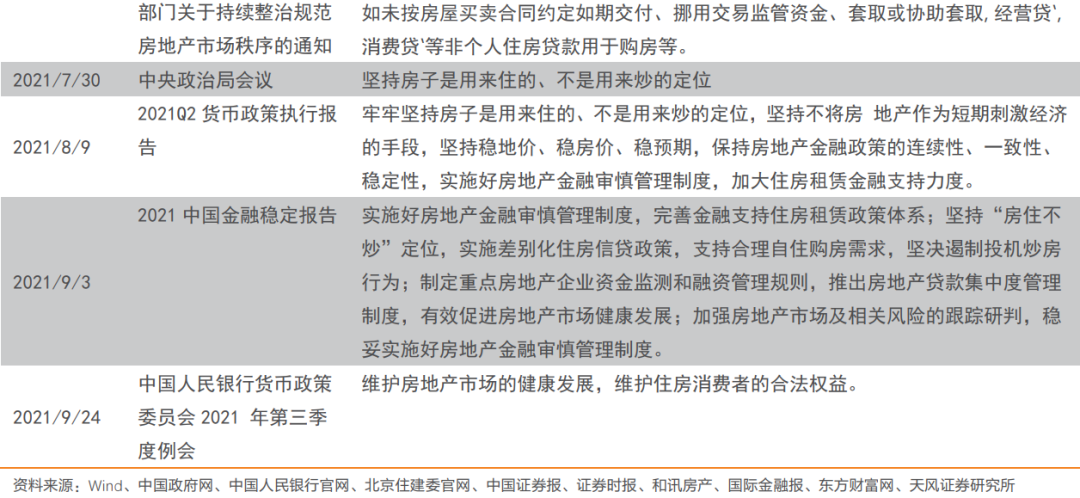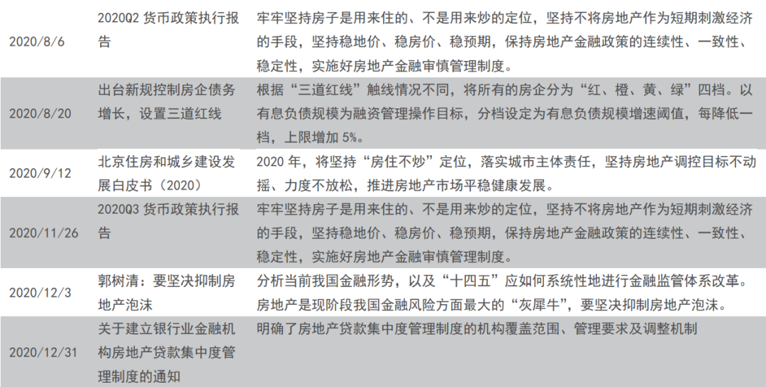 从近期房地产行业政策导向来看,政策仍然牢牢坚持房子是用来住的、不是用来炒的定位,坚持不将房地产作为短期刺激经济的手段。从去年8月三道红线和12月房地产贷款集中度管理政策推出开始,房地产市场的政策调控不断,陆续推出了集中供地、建立购地资金审查和清退机制等政策,加大市场乱象查处力度,加强交易资金监管、突出整治“经营贷”,“消费贷”等非个人住房贷款用于购房等,房地产市场步入全面监管和调控阶段。