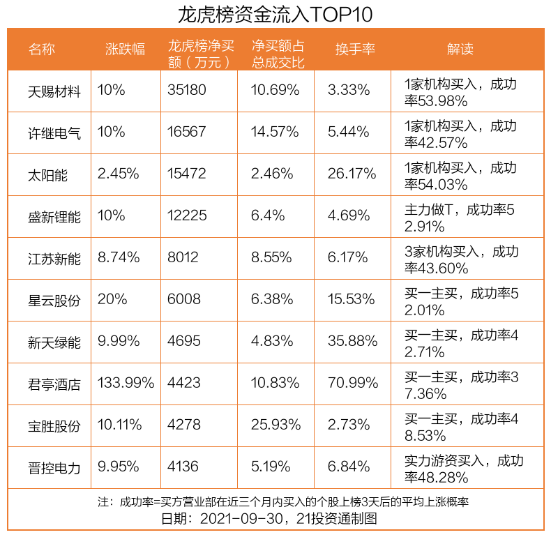 9月30日,上证指数上涨0.9%,深证成指上涨1.63%,创业板指上涨2.19%。盘后龙虎榜数据显示,共有36只个股因当日异动登上龙虎榜,资金净流入最多的是天赐材料(002709.SZ),达3.52亿元。