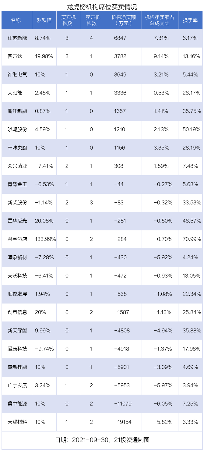 其中,机构净买入金额最多的是江苏新能(603693.SH),当日收盘上涨8.74%,换手率为6.17%。