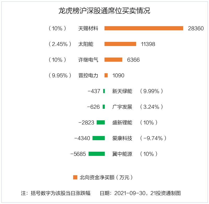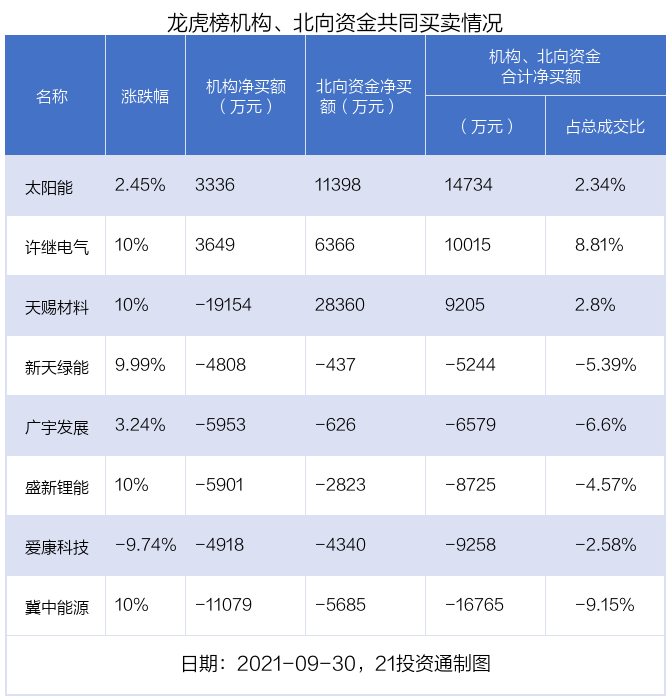 值得注意的是,机构和北向资金共同净买入了太阳能、许继电气等2股;共同净卖出了新天绿能、广宇发展、盛新锂能、爱康科技、冀中能源等5股;在天赐材料上出现分歧,机构净卖出天赐材料1.92亿元,北向资金净买入2.84亿元。