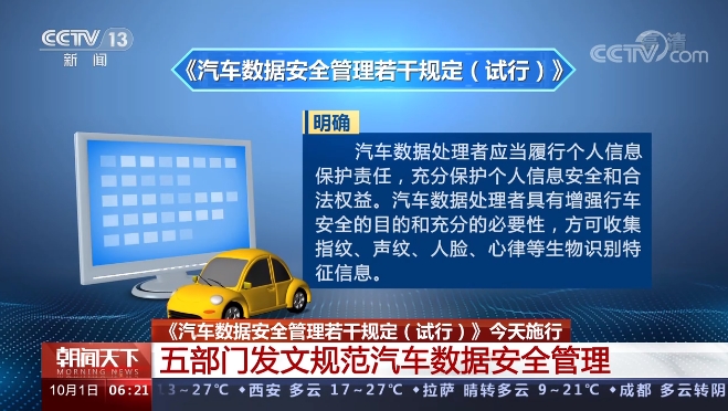由国家网信办等五部门联合发布的《汽车数据安全管理若干规定(试行)》,今天(10月1日)正式施行。