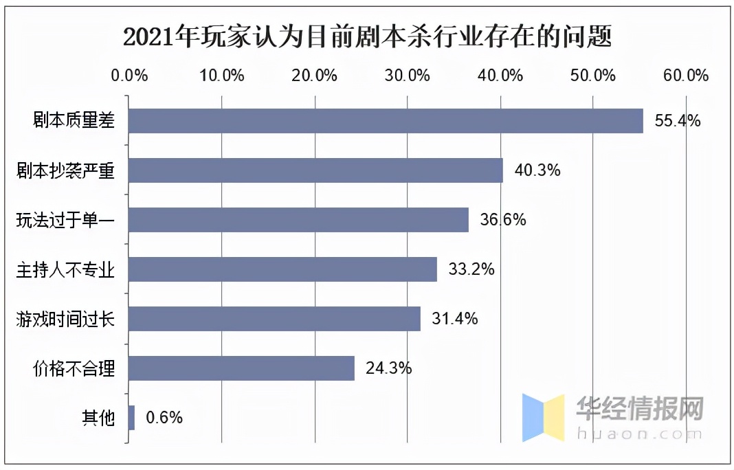 华经情报网数据显示,55.4%的玩家认为剧本存在质量差的问题,40.3%的玩家认为行业内的剧本抄袭严重。如果门店不把好剧本质量关,让用户花费3-4个小时的时间体验后给出差评,意味将失去这名用户,用户会认为这家门店挑选剧本的能力有问题,失去信任关系后,多数用户不会愿意再花3-4个小时的时间冒险去尝试新的剧本。