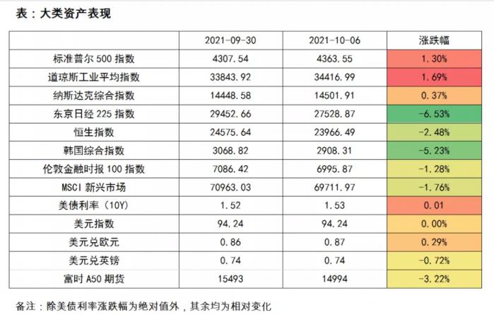 十一假期期间,宏观层面我们认为有两件大事,一是全球市场对通胀的预期上升较快,我们看到能源价格不断创新高,美油、布油、天然气的价格都创了新高,彭博商品现货指数也创新高。快速升温的通胀预期给权益市场带来的冲击是直接而明显的,全球股票市场,尤其是非美市场的股指,表现偏差。第二是美国债务上限的问题一定程度上加剧了市场风险偏好的收敛,这同样给权益市场带来了压力。