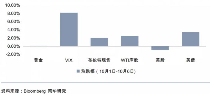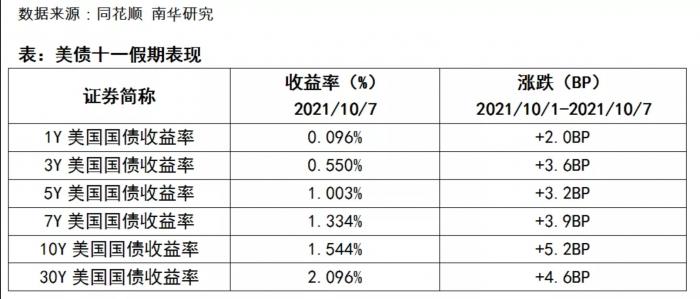 截至10月7日,10年期美债收益率收为1.544%,较9月30日走升5.2BP。美债收益率整体上行主要是因为9月美联储议息决议表态偏鹰,市场预计11月会开启Taper,加上近期小非农数据超预期,使得美联储退出量化宽松的概率更大。