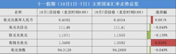 人民币汇率十一假期行情回顾截至北京时间10月7日8:00,十一期间(10月1日,10月4日-7日)全球外汇市场行情及大类资产表现如下,美元指数呈“V”型高位微幅偏弱走势,离岸人民币及欧元相对于美元贬值,日元及英镑相对于美元升值;黄金(美)、VIX、布伦特原油现货、WTI库欣原油及十年期美债均上涨,美股(标普500指数)下跌。