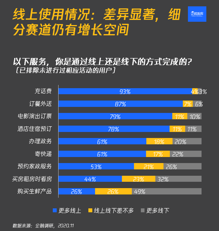 懒人经济涵盖到生活的方方面面,包括外卖、跑腿、家政等方方面面。通过调查数据显示,约87%的用户更多通过线上的方式完成生活服务,其中充话费位列第一。在懒人经济刚起步阶段,“懒人”与“懒人经济”是一种相互促进,相互超越的关系,需求带动生产,生产刺激需求。为提高生活服务质量,这些生活服务领域不断向线上拓展,进一步实现数字化、信息化、智能化,即使是在存量流量环境下,仍有比较乐观的增长空间。未来,懒人经济的赛道会被不断细分,