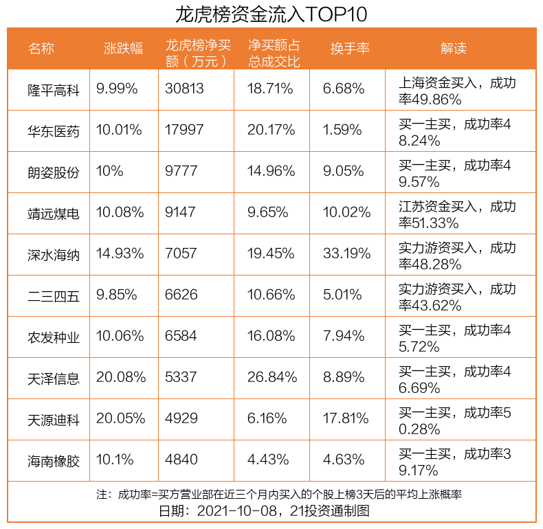 10月8日,上证指数上涨0.67%,深证成指上涨0.73%,创业板指下跌0.04%。盘后龙虎榜数据显示,共有45只个股因当日异动登上龙虎榜,资金净流入最多的是隆平高科(000998.SZ),达3.08亿元。